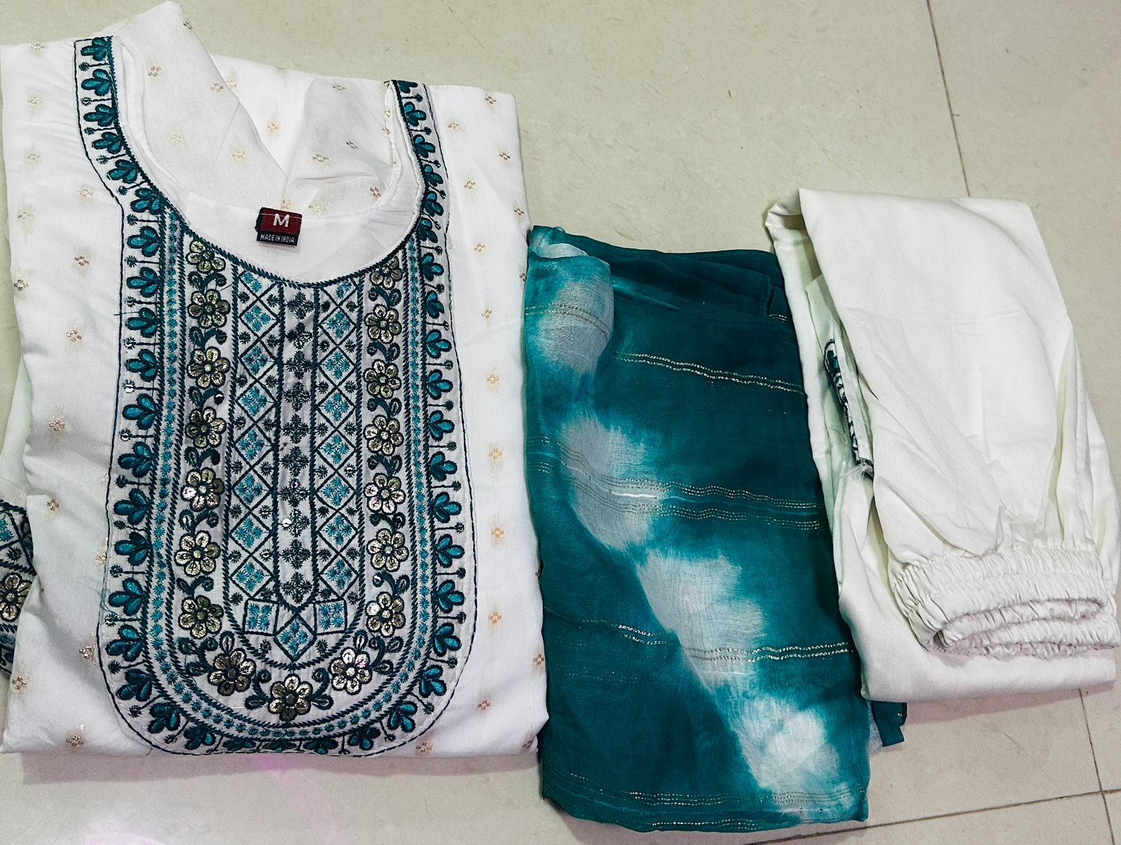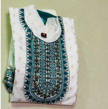 | Bottom | Plain White Fabric (for custom tailoring into pants, salwar, or churidar) |